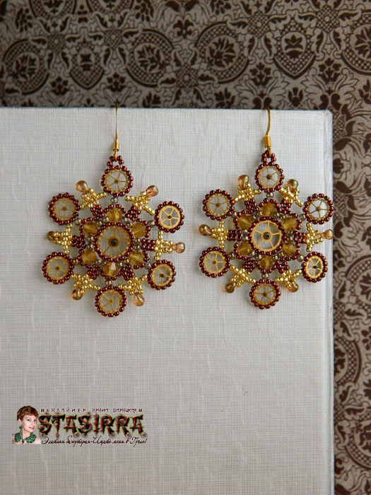 Легкие, ажурные сережки с часовыми шестеренками, мелким ювелирным бисером и кристаллами.