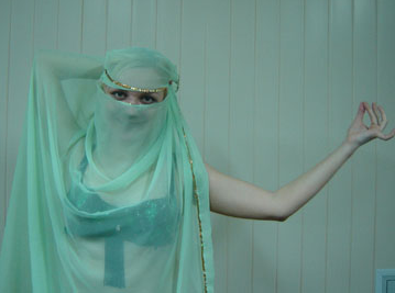 Чтобы сделать «прогиб с платком» по ходу вашего выступления, вам необходимо следующее. Для начала, выставляем вперед одну ногу. Нога, на которую вы будете опираться, прогибаясь, должна быть сильной, а не наоборот. От этого во многом зависит ваша безопасность во время выполнения движения. Платок держим за спиной, вытянув руки в стороны. Теперь перекидываем его через голову вперед, опускаем на ступню вытянутой вперед ноги. Медленно поднимаем платок по ноге вверх, одновременно плавно отклоняемся назад. Вы поднимаете платок, насколько сможете, но желательно прогнуться как можно ниже. В лучшем случае вуаль покроет ваши бедра, живот, грудь, шею и голову. Натягивая платок на грудь и выше, вы разводите руки под платком в стороны. Это - ваш максимальный прогиб, из которого, однако, вы должны найти силы так же элегантно встать. Начинать подъем вверх лучше с движений руками. Поднимите одну руку под платком змееобразными движениями вверх. То же самое со второй. Тяните руки вверх, плавно поднимая за ними корпус. Делайте движения руками как можно мягче. Когда подниметесь за руками вверх, снова разведите руки под платком в стороны и на пару секунд замрите в таком положении. Если удастся, сохраните вуаль у вас на лице. Ее можно будет снять различными способами, но ваша загадочность от этого только возрастет. Во время выполнения прогиба обратите внимание на свои ощущения, не спешите, не наклоняйтесь слишком низко, при возникновении болевых ощущений прекратите движение. «Прогиб с платком» – это еще и прекрасное движение для начала танца. Для этого нужно перед началом выступления хорошо разогреть мышцы, заранее, до начала музыки, прогнуться и накинуть на себя вуаль. Тогда танец начинается с движения руками и снятия с себя платка. Покрытие себя платком также очень эффектно смотрится в партере, при прогибах назад, однако, такое исполнение требует гораздо более серьезной физической подготовки, чем вариант стоя. Не торопитесь все попробовать, будьте уверены в своих силах. Что касается платка, то он должен быть полупрозрачным и довольно легким, чтобы не напоминать покрывало и не создавать ощущение тяжести. Конверт Вряд ли есть более загадочное и притягательное движение с платком в восточном танце. Американцы называют его love letter, то есть, любовное послание. «Конвертом» называется движение, при котором вы как будто запечатываетесь внутрь вуали, пряча в ней верхнюю часть туловища, а затем постепенно освобождаетесь. Для того чтобы выполнить «конверт», вам понадобится достаточно широкий шарф – от 2.30м и шире. Длина также может быть больше стандартной (1.10м). Если ваш платок имеет размеры 3х1.50м, это замечательно. Плотность ткани здесь не имеет значения, поскольку движение практически статично, и оно в равной степени красиво смотрится с полупрозрачным и непрозрачным платком. Рассмотрим самый обычный вариант «конверта», исполняемый в ходе выступления. Начинайте делать это движение, вращаясь как обычно. Платок - у вас за спиной на вытянутых в стороны руках. Не останавливаясь, приблизьте друг к другу прямые руки перед собой. Возьмите оба конца вуали крепко в левую руку, правая рука свободна. Оттолкните вуаль левой рукой влево, правую руку отведите вправо. Платок натянется вокруг вас. Поднимите обе руки вверх, распрямите локти. Вуаль закрывает вас спереди и сзади. П