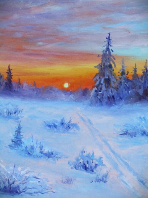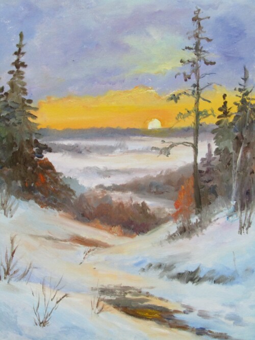 В её работах заснеженные леса, деревенские дороги, прозрачный морозный воздух и то особенное состояние природы, когда всё замирает, но остаётся живым. Эти зимние пейзажи про тепло памяти: скрип снега под ногами, дым из трубы, свет в окне дома на краю деревни.
